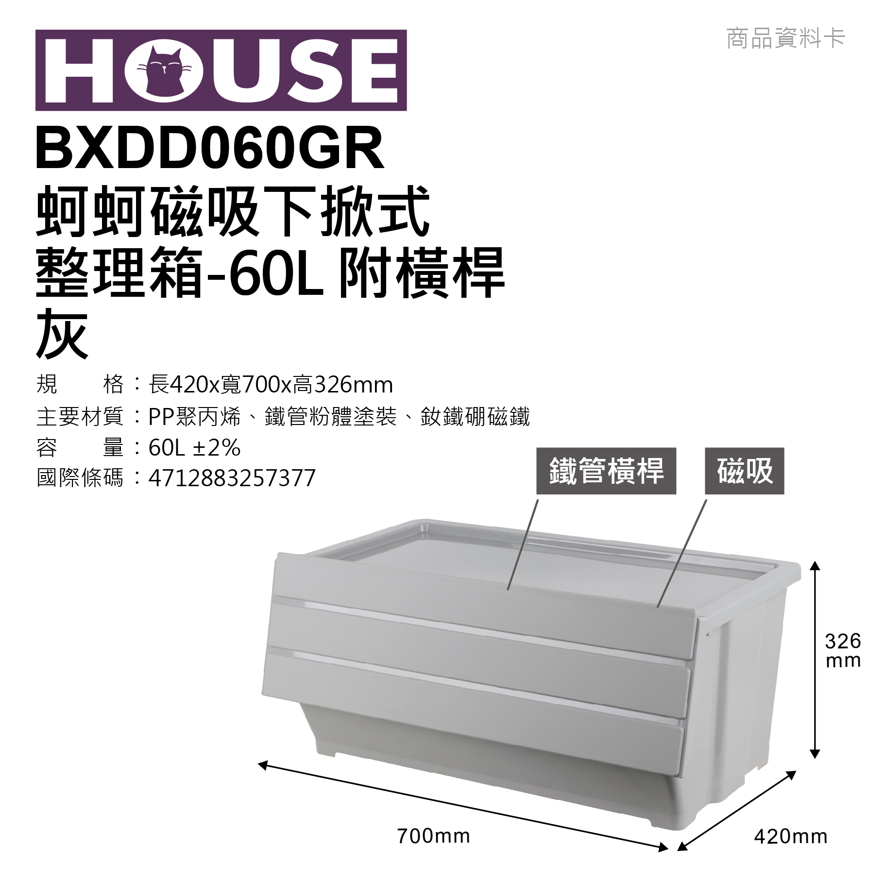 【型號】BXDD060GR【尺寸】長420x寬700x高326mm【容量】60L ±2%【材質】PP聚丙烯、鐵管粉體塗裝、釹鐵硼磁鐵